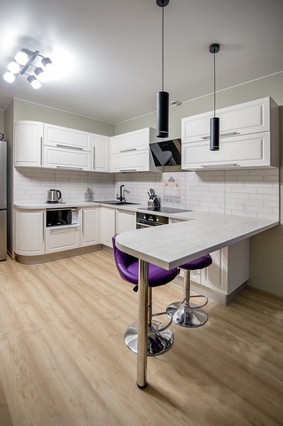 Наиболее распространенный и один из самых удобных! Маленькие кухни, выстроенные углом – отличное решение для тех, кто любит готовить, но терпеть не может от этого уставать! Разместив мойку в угловой части, а зоны для готовки и хранения продуктов по бокам, Вы получите классический эрго-треугольник, где все важнейшие элементы кухни находятся от Вас на равном расстоянии. Это очень удобно!