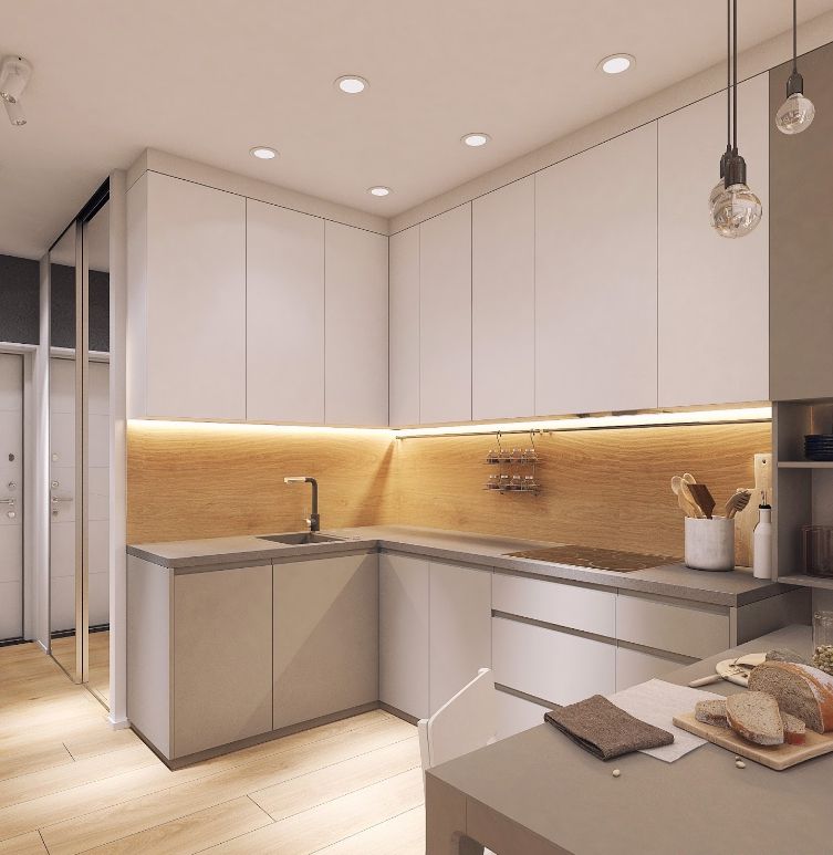 Здесь стильно будет стильно смотреться барная стойка, выполненная в креативном дизайне; необычной формы стулья; ультрасовременная бытовая техника; а также красивая светодиодная подсветка, придающая помещению элегантный и изысканный внешний облик.