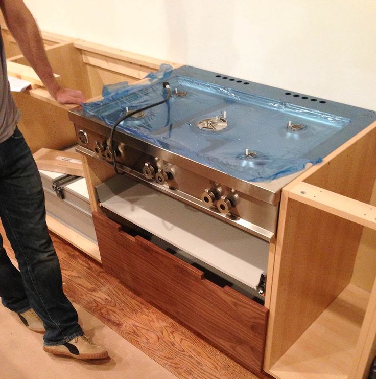 Как показано здесь, верхние лицевые рамы шкафа и боковые панели проходят под каркасами, создавая валентность для освещения под шкафом. После того, как этот шкаф будет установлен, шкурки из вишневой фанеры толщиной 1/4 дюйма покроют днища каркасов из кленовой фанеры. Микроволновая печь скроет оставшуюся открытую кленовую фанеру.
