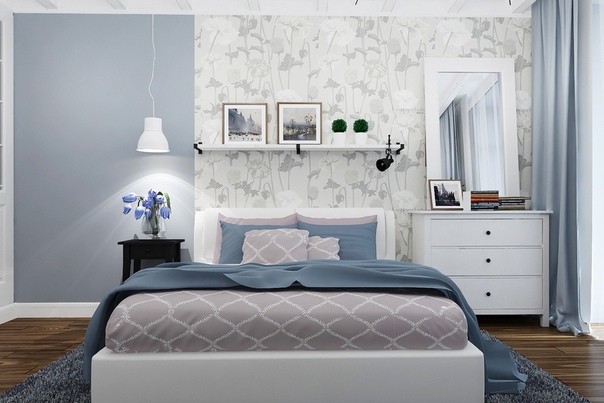 - Сделать спальню воздушной помогут обои светлых оттенков. Текстиль темных цветов расставит необходимые акценты;