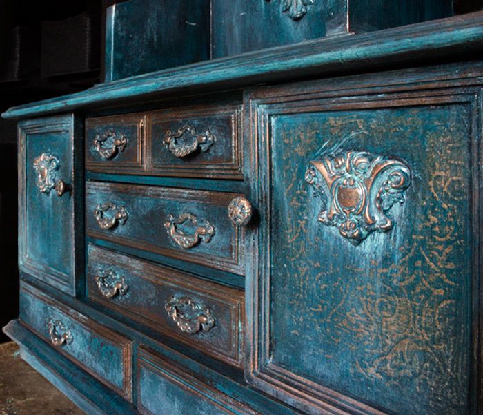 - Окрашивание старой мебели патиной или кракелюрным лаком – тоже неплохой вариант.