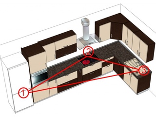 Основные рабочие зоны на кухне – плита, мойка и холодильник.