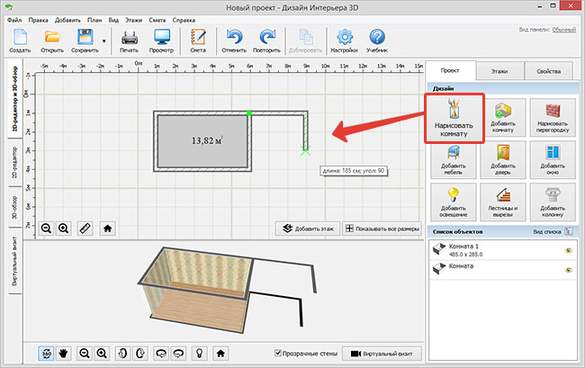 Чтобы создать план расстановки мебели, используйте опцию «Нарисовать комнату» в блоке «Дизайн».
