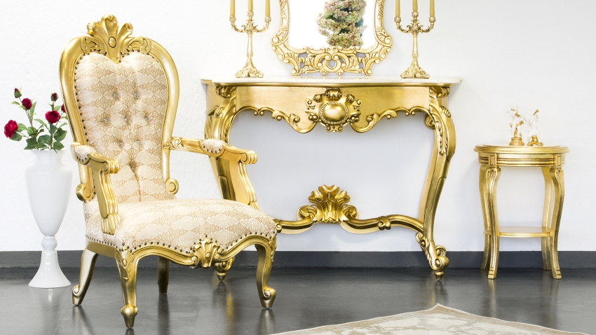 Для акцентирования используются золотые оттенки, а за основу берутся цвета: красные, белые, венге. Дорогая мебель призвана подчеркивать пышный интерьер, а ножки кресел или стульев могут быть самыми разнообразными: в форме сфинкса, с узорами, что добавляет эффектности.