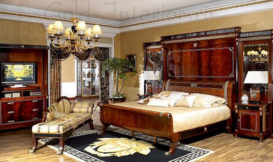 Шкафы для спальни должны быть изготовлены из дорогостоящих пород дерева и быть внушительными по размерам (самая минимальная ширина – 130 см). Часто в шкафы встроены зеркала, а также в их дизайне предусмотрены красивые фигурные ручки. Кровати, как правило, массивные, а их изголовье привлекает своей резьбой или обивкой.