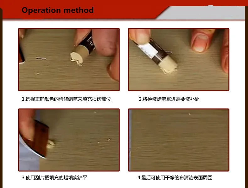 КАК ИСПОЛЬЗОВАТЬ: Есть два способа использования восковой шпатлевки. Первый – плотно прижать восковую шпатлевку к области, подлежащей заполнению (например, к царапине, вмятине, отверстию от гвоздя и т. д.). воск по области. Удалите излишки воска с помощью тупого пластикового скребка.