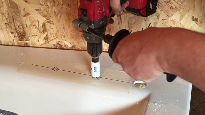 Чтобы поставить водопроводный кран чаще стандартно вырезают отверстие не более 35 миллиметров. Если изделие изготовлено из искусственного камня, то для работы можно использовать перьевое свело или фрезу форстнера такого же диаметра. Обороты при этом должны быть невысокими и усреднёнными. В процессе работы будет выделяться большое количество стружки. Искусственный камень имеет в своем составе пластик, имеющий неприятный запах. Поэтому лучше использовать защитные маски.