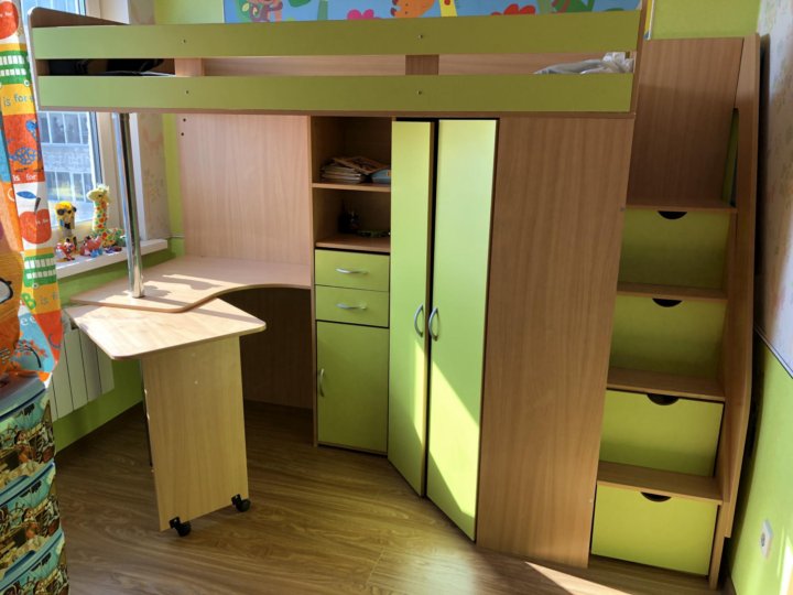 Нижнюю часть каркаса кровати-чердака дополняют столешницей, где можно делать уроки. Наверхунаходится спальное место. Пространство под столешницей заполняют мобильными ящиками. Свободное место между спальным и рабочим местом нередко используют для размещения органайзеров, хранения книг.