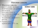МОУ сош п. Сулея 2005 год Реферат по физике на тему: «Старинные меры вычислений длины, веса и объёма». Выполнила: уч-ца 9Б Кл. Рязанова К. Проверила: Ириневич А.Г. Длина — одно из первых геометрических понятий, введённых человеком. Первые меры длины были самыми естественными и поэтому сохранились и по сей день. Действительно, в газетах можно прочесть такие фразы: «Избушка находилась от посёлка на расстоянии двух дневных переходов», «Трещина шириной в ладонь пересекала каменную плиту». Но насколько удобными были изначальные меры длины – локоть, вершок (ширина ладони на уровне пальцев), сажень (Расстояние между концами пальцев разведённых в стороны рук) – ведь они всегда при себе, настолько они были неточными, ведь у разных людей эти единицы различны. Государствам приходилось вводить эталоны длины – образцовые единицы измерения. Но в разных странах эти единицы оказывались разными. Так, три русских локтя составляли два персидских.