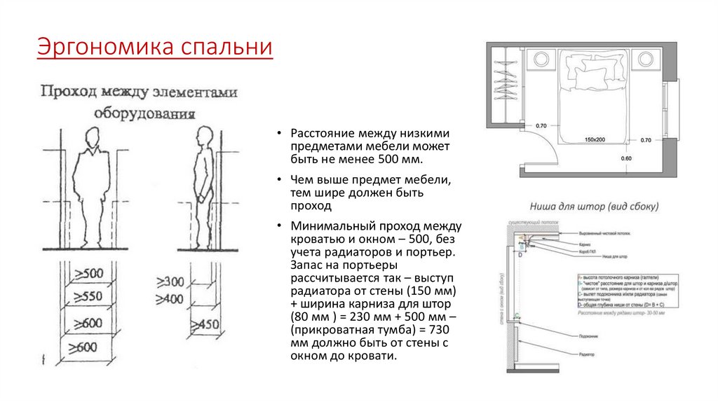 Известно, что здоровый отдых включает здоровый сон. Поэтому помещение спальни должно отвечать требованиям беспрепятственного перемещения по нему и создания условий для отдыха и крепкого сна. Проектируя спальню, учтите следующее в эргономике ее пространства: