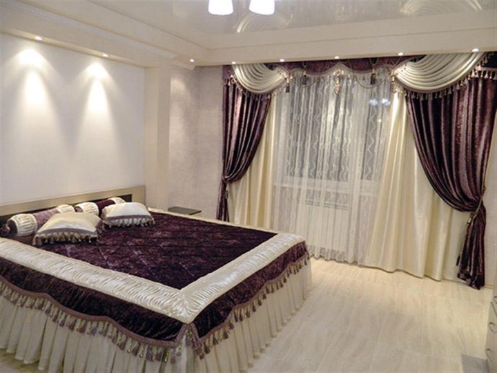 В зависимости от материала, нужно быть внимательным по отношению к различным отделочным материалам, так как лишние канты, помпоны, объемные ламбрекены, подвески и рюши скрадывают пространство и не всегда подходят к спальным комнатам.