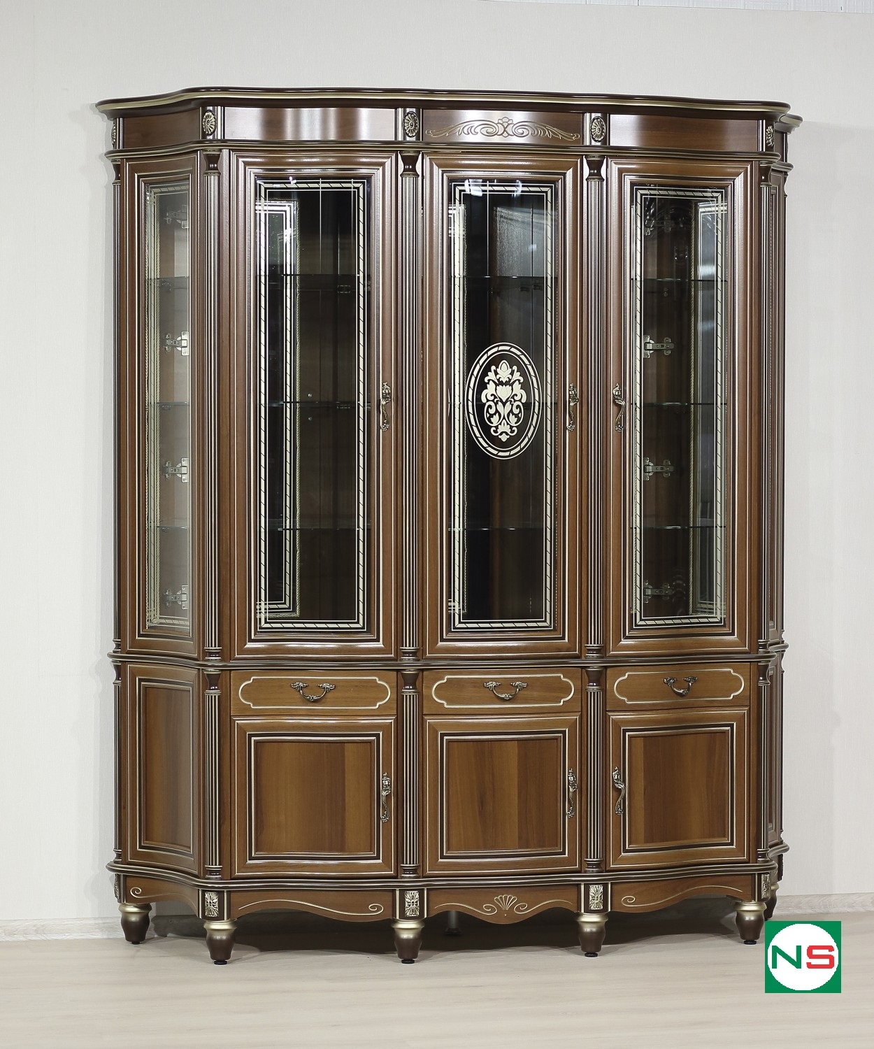 Часто витрины производятся в цвете «орех». Такая мебель смотрится элегантно, сочетается с классическим или барочным стилем. Украшения резьбой усиливают впечатление.