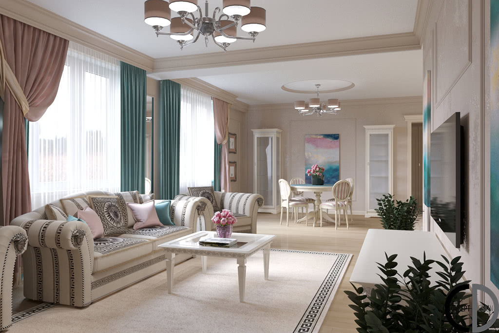 - Дизайн гостиной всегда связан с другими помещениями в том же стиле неоклассика: одно будто перетекает в другое. Между комнатами используются арки и легкие перегородки, которые могут в любой момент убраны.