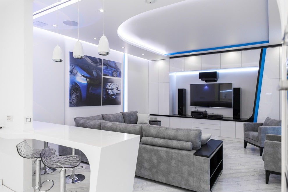 Заливной глянцевый пол будет отлично смотреться в комбинации с матовой стеной. Замысловатые лампы и подвесные шкафы создадут футуристический образ и будут способствовать креативу в комнате. Любители громкой музыки и качественного кино устанавливают в гостиной аудиосистему. Ответственно отнеситесь к вопросу выбора подходящих штор и тюлей. Оригинальным решением является установка альтернативных ширм. Создать параллель между этим помещением и местом приготовления пищи поможет установленная барная стойка. Пространство центральной зоны следует насытить символами современной динамичной жизни.