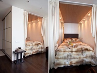 Интересный эффект можно получить при установке ниши под спальню в квартире-студии. Такой прием не только хорошо зрительно зонирует пространство, но и может иметь более практичное применение.
