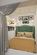 Глубокую нишу можно закрыть подходящими под общий интерьер шторами – тогда спальное место будет спрятано от посторонних глаз, а сама ниша послужит местом для хранения вещей.