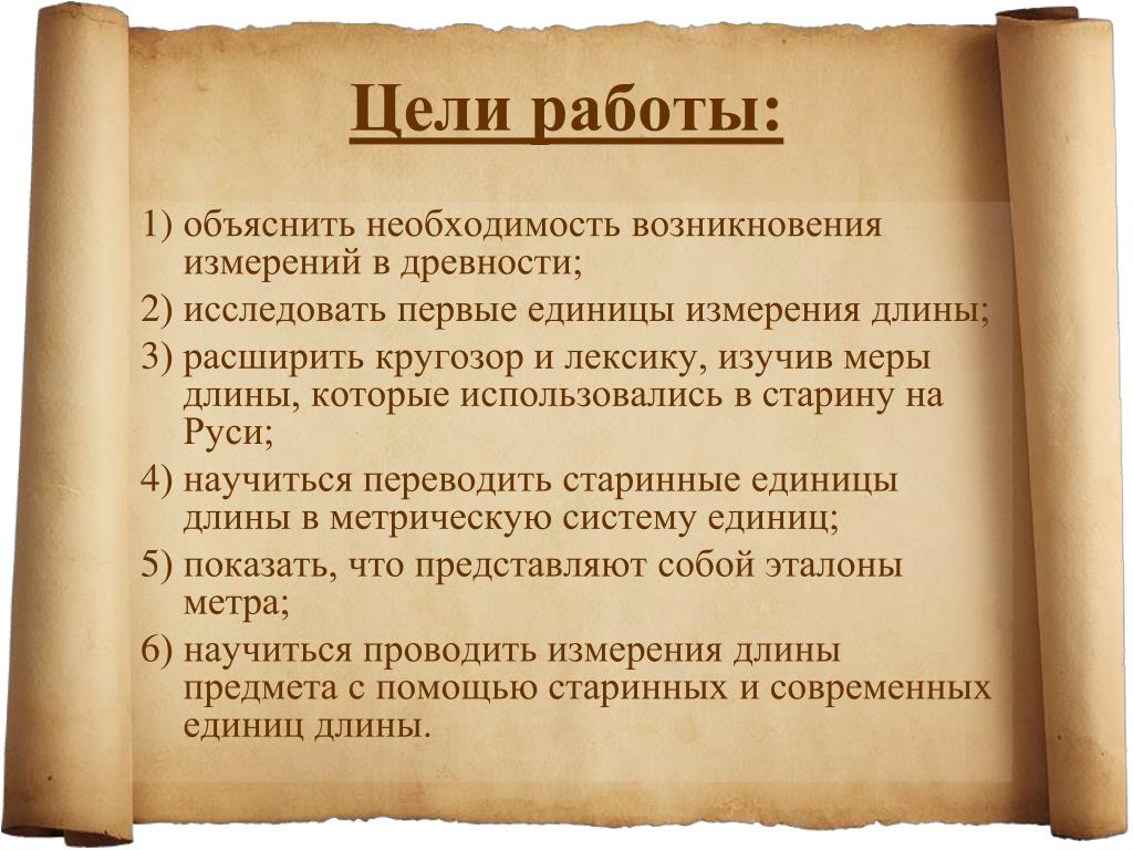 Гипотеза : Старинные меры длины до сих пор используются в повседневной жизни. Цель работы : Изучить старинные меры длины и найти отражение этих мер на современном этапе . Задачи: Найти и проанализировать источники об истории мер длины. Рассмотреть использование древних мер длины в современном обществе. Выяснить, что означают пословицы и поговорки, в которых встречаются названия старинных мер длины и веса. Перевести старинные меры в пословицах и поговорках в современные. Проанализировать меры длины в литературе.