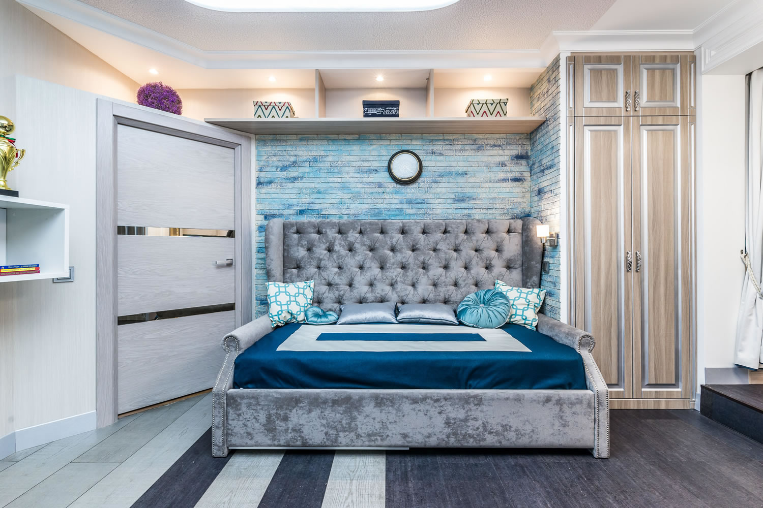 Сэкономить место в однокомнатной квартире удастся, выбрав раскладную кровать или угловой диван. Ложе не должно стоять посередине комнаты: желательно, чтобы спинка была вблизи стены, но не вплотную к ней.