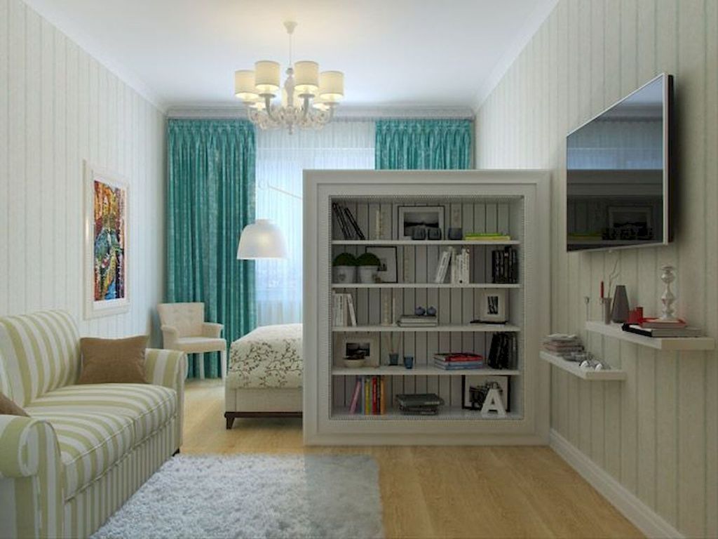 Площадь однокомнатной квартиры можно разделить межкомнатными перегородками, ширмами, стеллажами, занавесками. Выбор остается за хозяевами квартиры, исходя из личных предпочтений и индивидуального вкуса.
