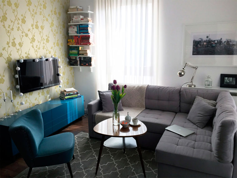‘Если гостиная немного меньше, ковер должен быть пропорционально меньше и только передние ножки дивана или стульев. следует положить на ковер. Для небольших гостиных разместите ковер прямо перед креслами, а небольшую мебель, например журнальный столик, расположите прямо на ковре».