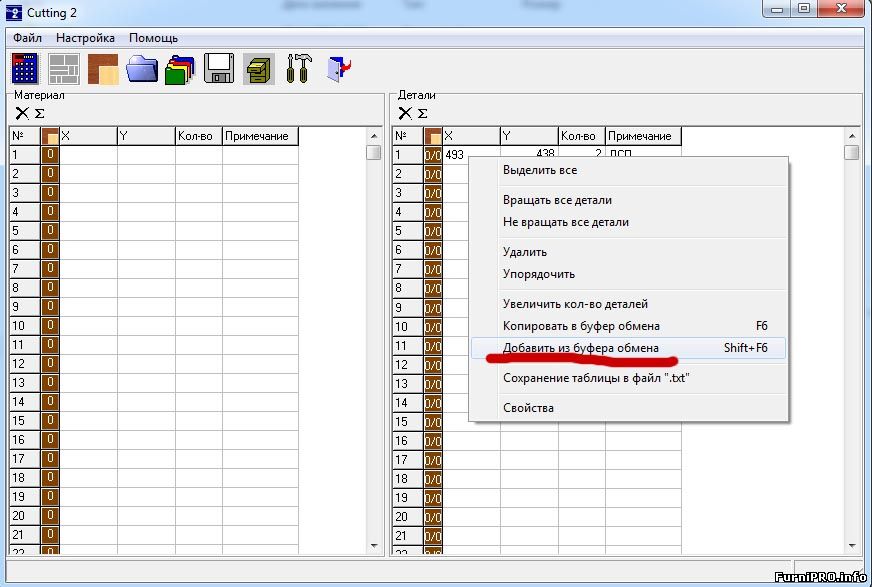 Кликаем по ней. Теперь мы можем таблицу с нашими элементами вставить в список деталей в Cutting 2. Но нам нужны только элементы основного материала, допустим ЛДСП толщиной18 мм. Поэтому открываем Excel и вставляем список элементов PRO100. Теперь выделяем те строки, в которых элементы не18 мми удаляем их. В результате остается таблица, состоящая из 4-х столбцов, в одном из которых во всех ячейках лишь цифра 18. Выделяем и удаляем этот столбец. Оставшиеся элементы выделяем и копируем. Запускаем программу Cutting 2. Таблица деталей справа.
