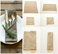 Можно сделать из салфетки кармашек, чтобы положить в него вилку, ложку и нож. Если стол решено сервировать тканевыми салфетками, нелишним всё же будет добавить бумажные, потому что гости часто будут вытирать руки и губы после жирной пищи, и тканевые салфетки достаточно быстро утратят первоначальный вид.