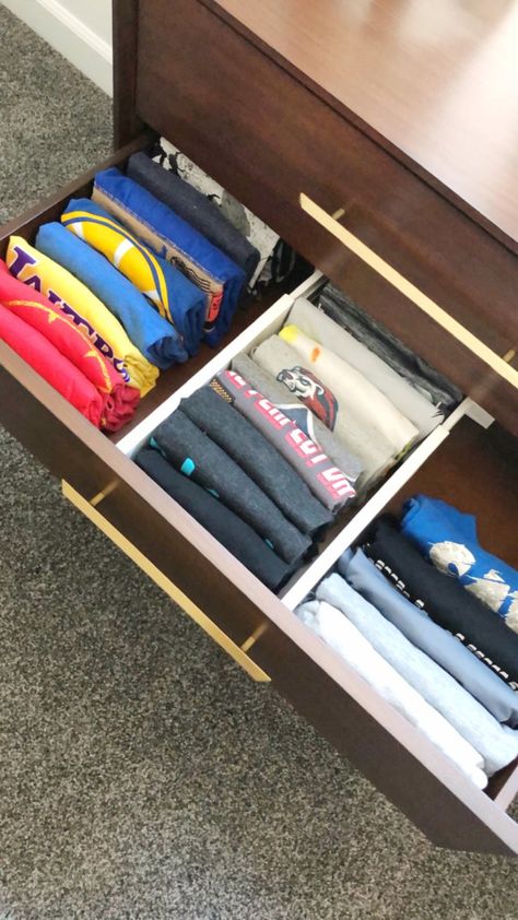 Вместо того, чтобы просто возвращать одежду в сложенных стопках, давайте сначала упростим эту область. Самая большая проблема с грязными ящиками — это когда вещи накладываются друг на друга, вызывая хаос и беспорядок. Разделение каждого ящика на секции поможет хранить вещи на своих местах.