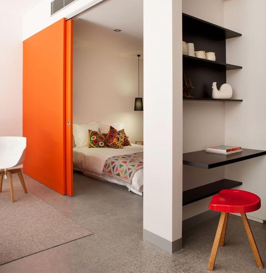 Кроме того есть вариант размещения кровати за раздвижными дверями. Таким образом, можно будет убрать кровать за двери, когда придут гости. А вот полупрозрачные двери смогут отлично пропускать свет и создадут уютную атмосферу спальни.