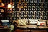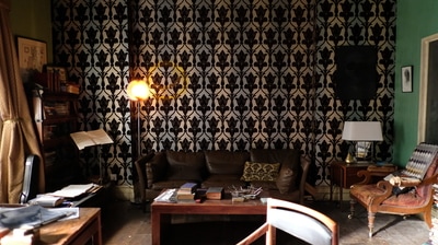 Джонс не хотел, чтобы обстановка в квартире выглядела слишком продуманной. Шерлок — гений и сумасброд, ему нет дела до порядка и интерьерной моды. Поэтому на фоне обоев с набивным рисунком светящегося синего цвета, который меняется в зависимости от освещения, разместили пюпитр с нотами как дань классической привычке Шерлока, и тут же — дизайнерский круглый торшер. Обои с крупным растительным узором поклеены только на акцентной стене, чтобы не создавать дисгармоничную атмосферу. На противоположной стене использованы другие, но не менее активные обои.