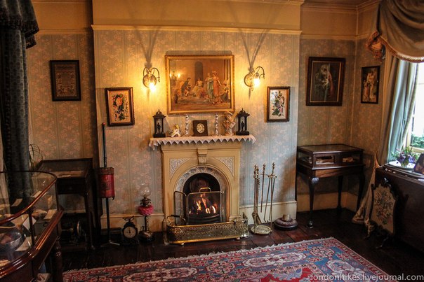 Камин — композиционный центр. Неяркое освещение, интерьер в классических викторианских цветах, пылающий камин, на каминной полке — старинные часы, газовый светильник на наклонной ножке, подсвечники, индийская шкатулка.