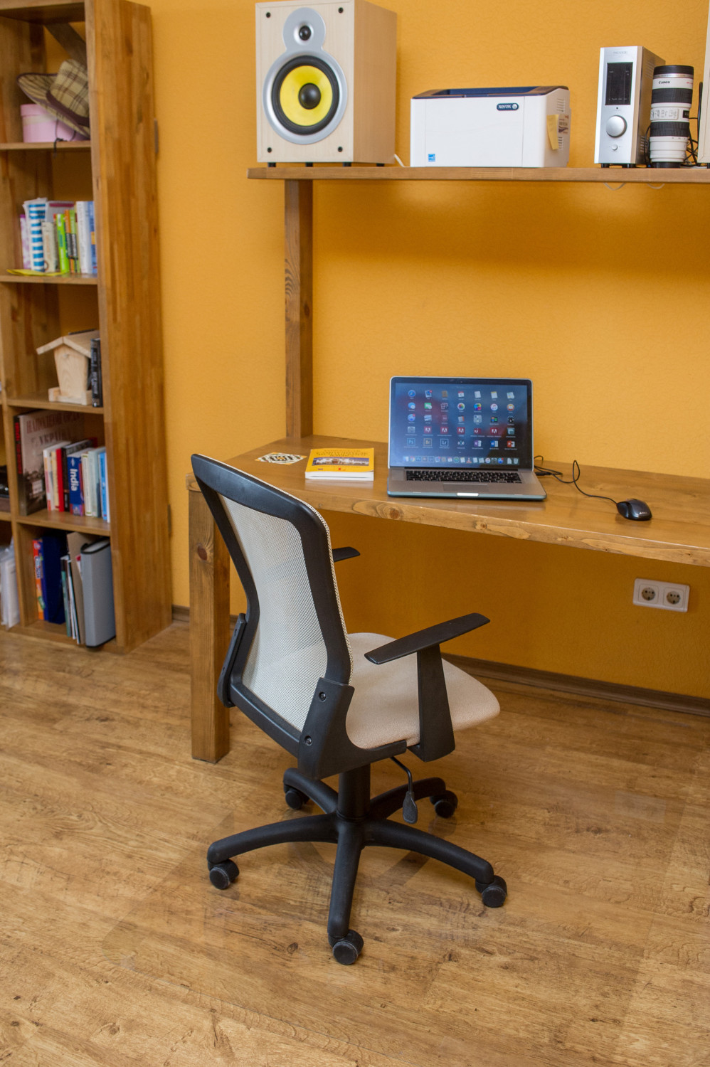 Если площадь квартиры небольшая, то многим приходится гостиную совмещать с рабочим кабинетом. В этом случае, чтобы не испортить напольное покрытие от постоянного перемещения колесиков кресла, нужно размещать на полу защитный коврик. Лучше всего отдавать предпочтение компактным моделям прямоугольной формы.