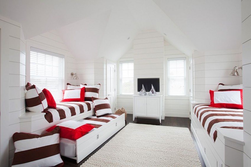 Экономит пространство в детской трехъярусная конструкция. Правда, в таком случае будет не очень удобно менять постельное белье. Кроме того, использовать такой вариант размещения трех детей можно лишь в квартирах и домах с высокими потолками.