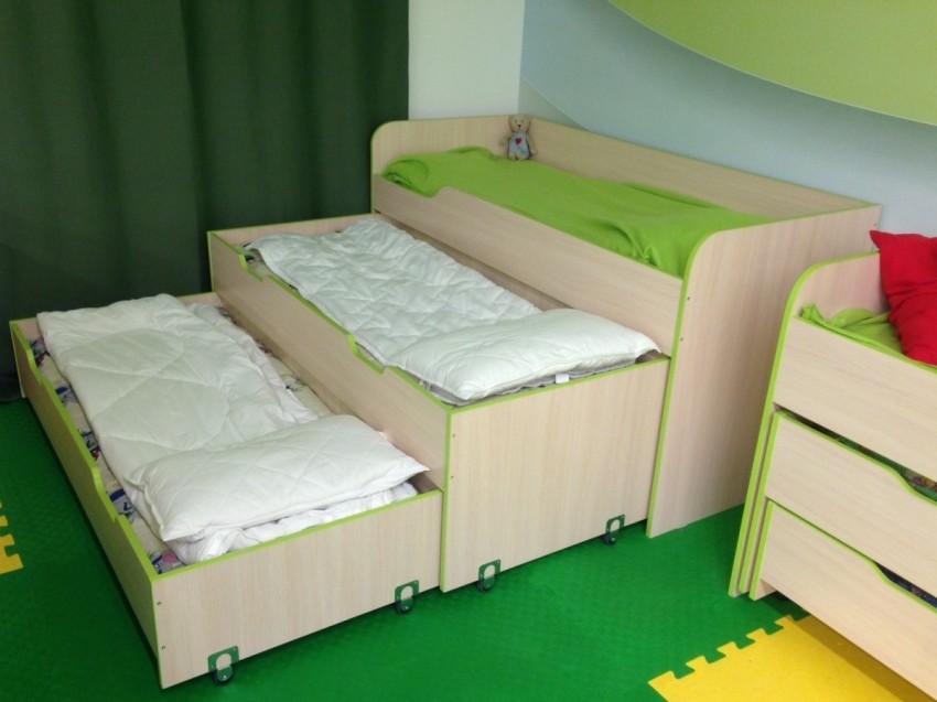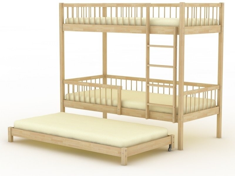- Выдвижная трёхъярусная кровать для троих мальчиков. Модель имеет деревянный каркас, окрашена в спокойные тона и не имеет острых углов. Очень компактная и практичная модель, так как каждое спальное место находится друг над другом. К тому же модель дополнена лесенкой со шкафчика и полкой для мелочей или книг внутри конструкции.