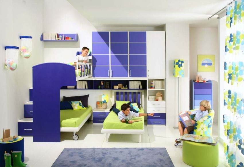 - Яркая кровать из нескольких цветов: каждый цвет символизирует секцию сна для определенного мальчика;