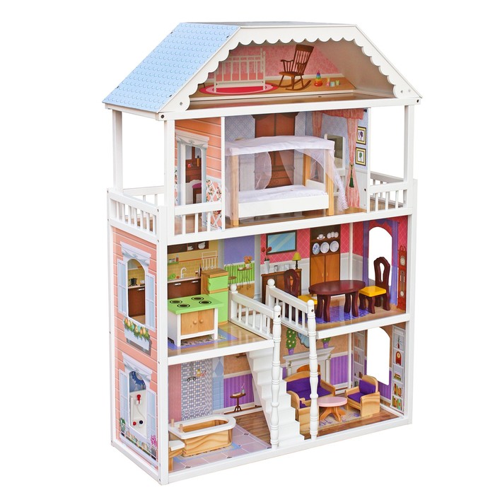В него умещаются куклы до 30 см. Высота здания составляет 115 см. В нем 5 уютных комнат и 2 открытые террасы. С верхнего этажа можно любоваться на окрестности. Мебель в комплект не входит. Ее покупают и устанавливают по усмотрению ребенка. Все детали выполнены из дерева и качественно обработаны. При производстве использовалась экологически чистая и безопасная фанера из березы толщиной 3 мм. Изделие сертифицировано.