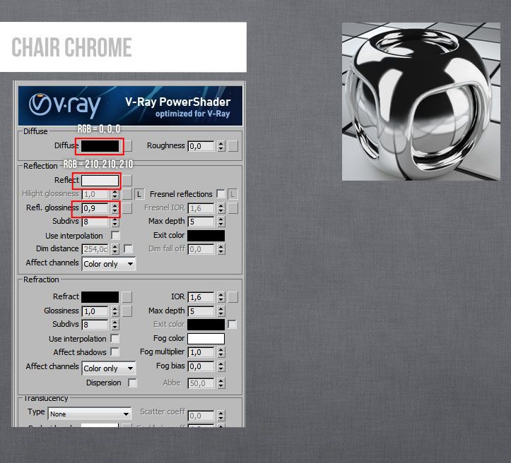 Следующая, 2 провалы в слоте отражения. Почему 2, спросите вы? Ну, первое это наш стандартный спад Френеля, чтобы отразить сцену, но второй затухание тени/света. Что это делает, так это гарантирует, что он отражает карта окружения только там, где на материал попадает максимальный свет. Когда делая чистый хром с трассировкой лучей, вам это не нужно, потому что вы получаете а реальное отражение вашей сцены. Возьмем следующий пример. Вот отражающий объект в простой сцене.