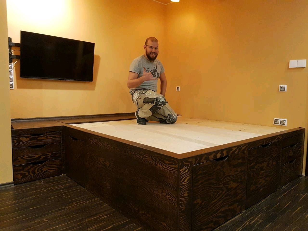 Затем нужно замерить площадь и сделать разметку, выбрать материал (из бюджетных вариантов лучше остановить свое внимание на ДСП толщиной не менее 15 мм). С созданием подиума может справиться один человек, но хорошо, когда есть помощник.В целом на сборку такой конструкции уходит 1-3 дня, в зависимости от сложности конструкции.