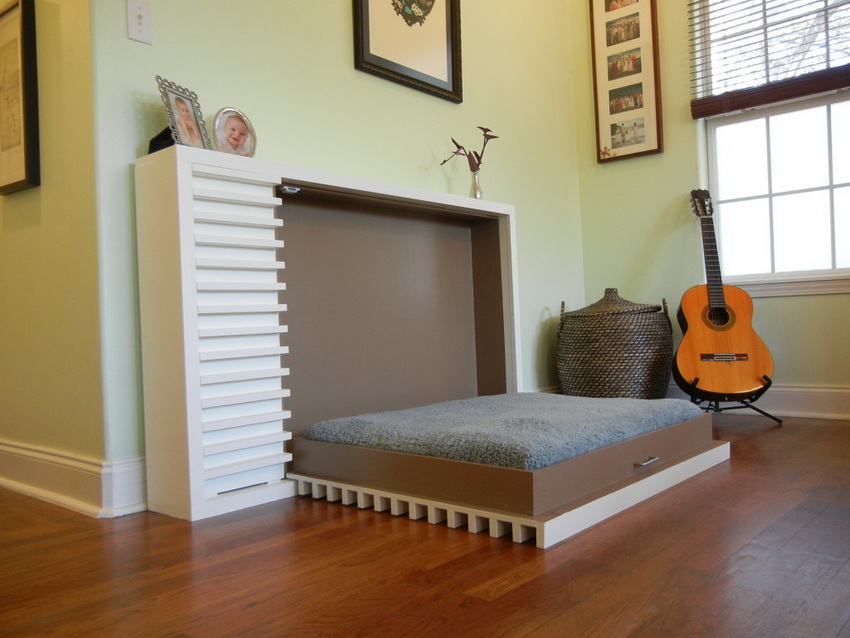 В собранном состоянии кровать никому не мешает и ее не видно. В случае надобности конструкция опускается и открывается спальное ложе, на котором можно отдохнуть. К тому же в конструкцию кровати нередко добавляют ящички для хранения вещей.