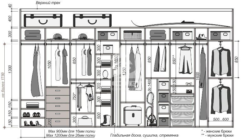 Размещение двух широких полноценных стеллажей шириной 60 см потребует минимальной ширины гардеробной 1,75 м;