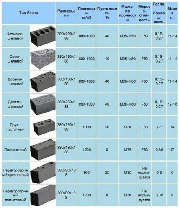 В среднем вес полнотелого шлакоблока может быть в пределах 25-28 кг, вес пустотелого – 18-23 кг, а пустотелого полублока – 10-13 кг.