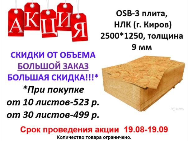 | OSB-3 Экодом | 2500×1250×9 | 17,5 | |