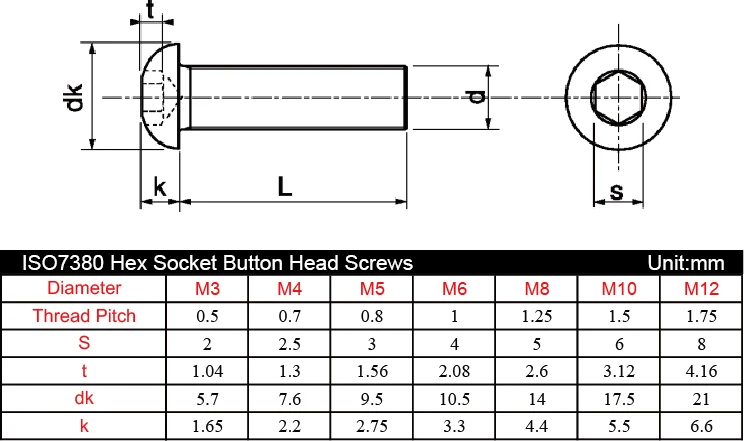 Размеры рабочих параметров винтов со шляпкой цилиндрической конфигурации, отображенные на чертеже исполнения, утвержденном ГОСТом 1491-80, представлены в табличной форме. Единица измерения здесь и далее –миллиметры.