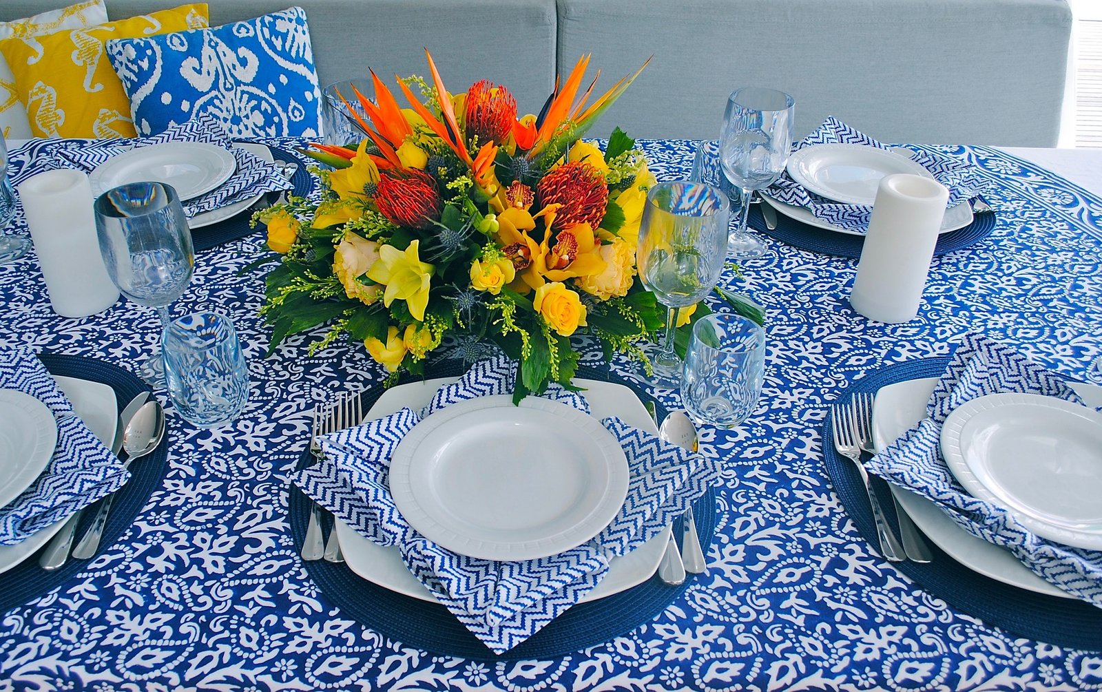 Настольные пейзажи с бирюзовыми лугами привносят щепотку элегантности в сервировку стола, украшенную кисточками ручной работы.