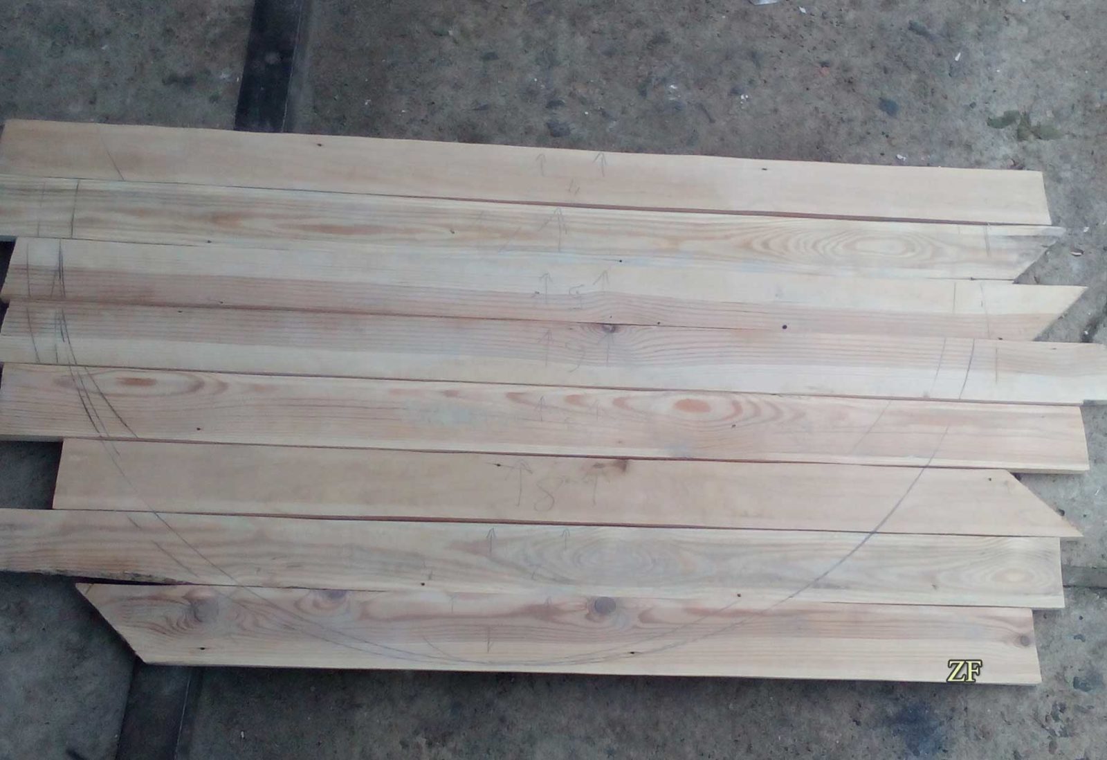 - Укладываем доски в нужное положение, добиваясь оптимального расположения годовых колец. Перед тем, как разобрать конструкцию, помечаем материал понятным нам образом (например, начертив треугольник). Разметка поможет в дальнейшем быстро найти нужную ламель. Торцы досок перед склейкой необходимо отфуговать.