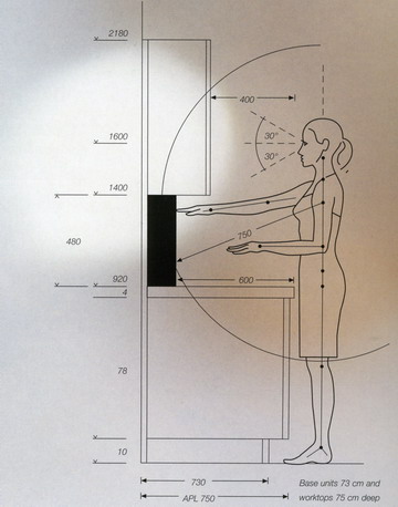 Стандартная высота верхнего ряда шкафов также была рассчитана на женщину среднего роста.