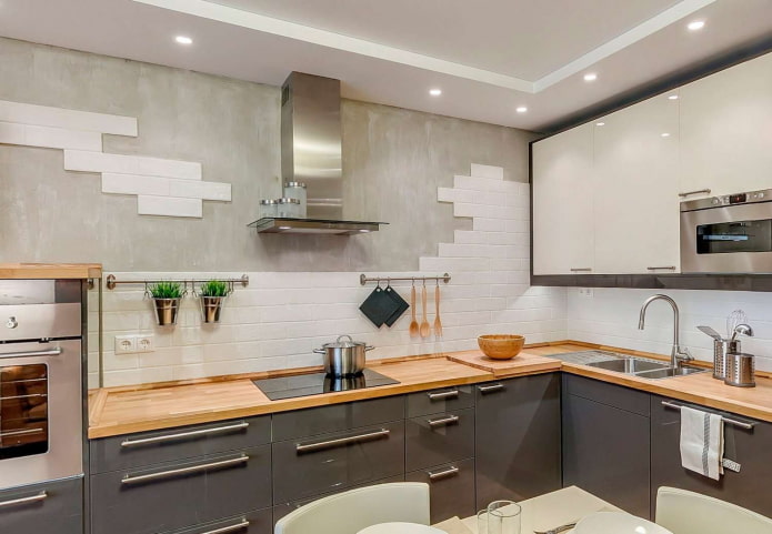 Наиболее распространена ситуация, когда мойка располагается в углу и вода при мытье посуды попадает на боковые стены — в этом случае ширина фартука на кухне может быть увеличена. Он заворачивается на угол и отделочным материалом покрывается боковая стена.