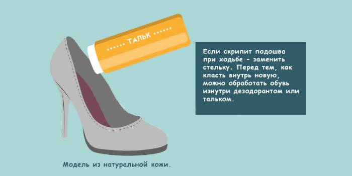 А чтобы любимая обувь не потеряла блеск, добавить к салу растопленный воск в соотношении 1:3. Оставить на ночь для впитывания состава. Утром удалить излишки сухой тряпочкой. Внутреннюю часть можно обработать уксусом или спиртом, это смягчит кожу и устранит ужасный звук при ходьбе.