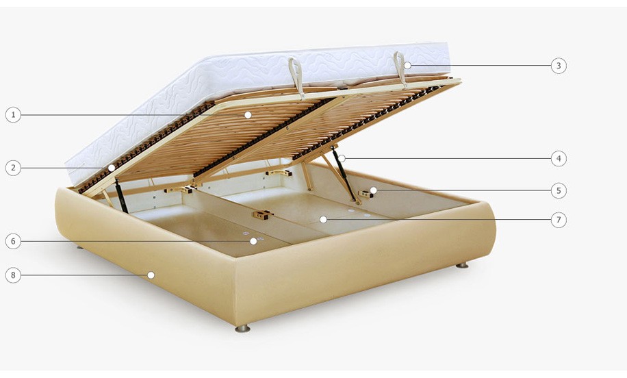 - У кровати скрипит подъемный механизм газлифт. Помогает силиконовая смазка. Иногда дополнительно нужно затянуть крепежи, фиксирующие подъемный узел.