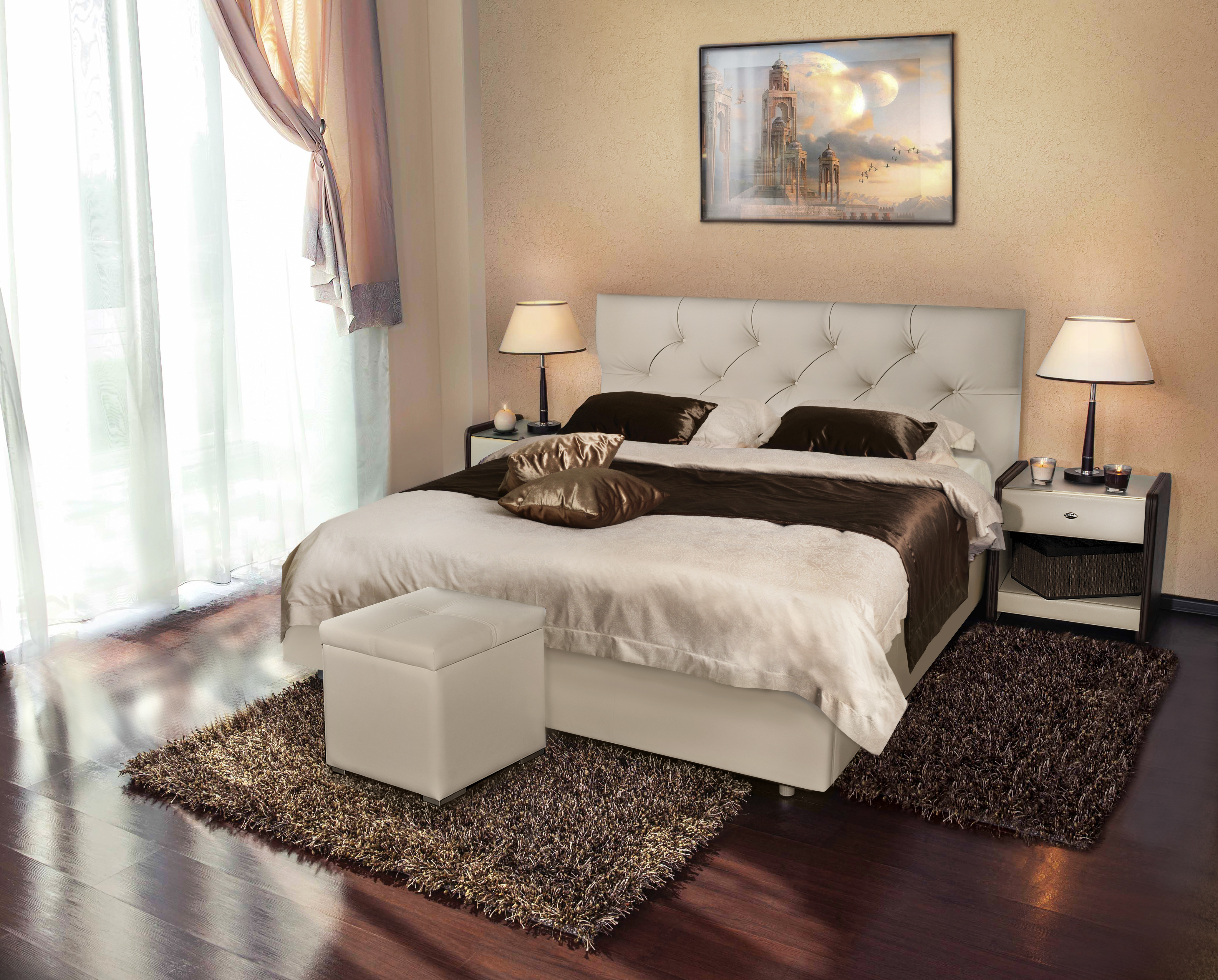 Белая мебель для спальни не обязательно должна быть кипельных оттенков. Цветовая гамма может варьироваться в бежевых и даже более темных цветах. Как правило, мебельный гарнитур включает в себя следующие предметы: