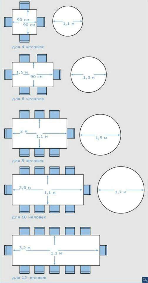 Исходя из этих расчетов, оптимальные размеры стола для 4-х человек, в зависимости от его формы, будут следующие: